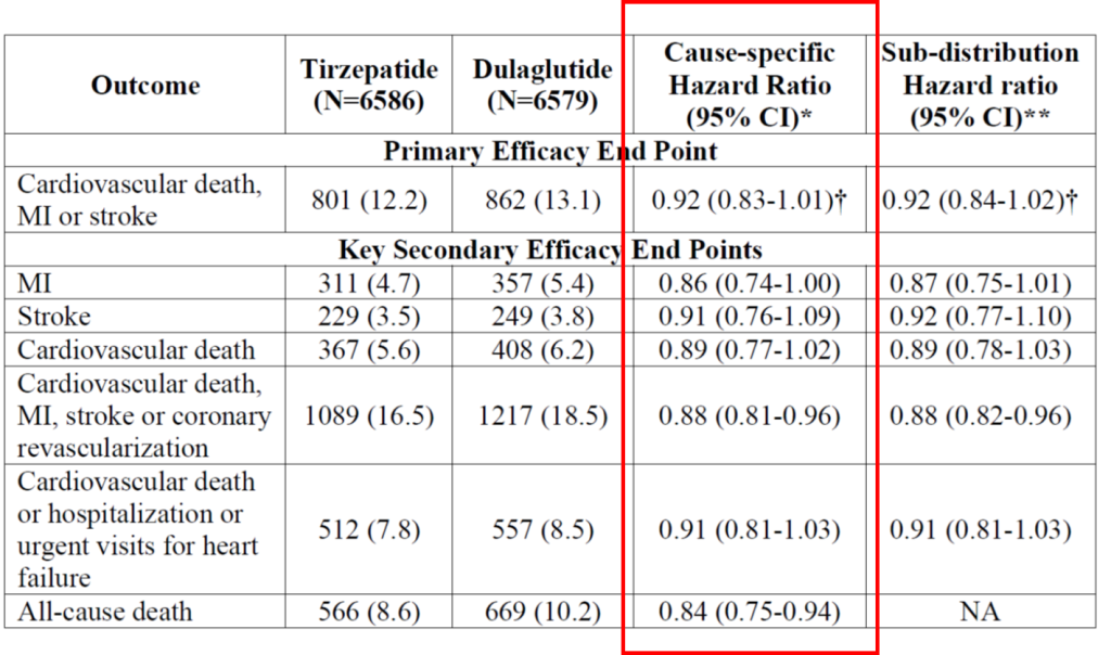 A primary end-point event (CV death, MI or stroke) occurred in 801 patients (12.2%) in the tirzepatide group and 862 (13.1%) in the dulaglutide group. This represents a hazard ratio for death from cardiovascular causes, myocardial infarction, or stroke of 0.92. The 95.3% confidence interval [CI], 0.83 to 1.01 was used. The nominal two-sided significance level was 0.047. This was above the p=0.003 value for non-inferiority. The p-value needed to be > 0.09 to be considered superior. Which means tirzepatide is as good as dulaglutide in reducing the primary end point.